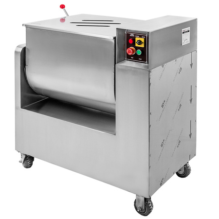 Elektryczna mieszałka do mięsa firmy Mega-M to profesjonalne urządzenie do mieszania mięsa, wyrabiania składników na jednolitą masę. Wyposażona w wychylną dzieżę z możliwością ustawienia kąta nachylenia misy, która ułatwia wyjmowanie farszu. Dzieża ze stali nierdzewnej jednorazowo pomieści do 100 kg farszu. Mieszarka elektryczna w całości wykonana jest ze stali nierdzewnej AISI 304, co zapewnia dużą wytrzymałość, odporność na uszkodzenia mechaniczne oraz biologiczną obojętność. Bieg wsteczny umożliwia cofnięcie masy i zapobiega zapychaniu się urządzenia.