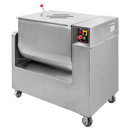 Elektryczna mieszałka do mięsa firmy Mega-M to profesjonalne urządzenie do mieszania mięsa, wyrabiania składników na jednolitą masę. Wyposażona w wychylną dzieżę z możliwością ustawienia kąta nachylenia misy, która ułatwia wyjmowanie farszu. Dzieża ze stali nierdzewnej jednorazowo pomieści do 150 kg farszu. Mieszarka elektryczna w całości wykonana jest ze stali nierdzewnej AISI 304, co zapewnia dużą wytrzymałość, odporność na uszkodzenia mechaniczne oraz biologiczną obojętność. Bieg wsteczny umożliwia cofnięcie masy i zapobiega zapychaniu się urządzenia.