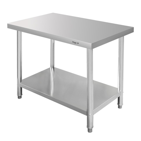 Centralny dwupoziomowy stół gastronomiczny 100x70x85 cm został wykonany ze stali nierdzewnej o grubości 0,6 mm, która jest odporna na intensywne użytkowanie i korozję oraz biologicznie obojętna (nie wchodzi w reakcję z żywnością). Stół gastronomiczny Mega-M STANDARD został wyposażony w dolną półkę, która stanowi cenną w każdej kuchni dodatkową powierzchnię przechowywania oraz regulowane nóżki, za pomocą których można zniwelować nierówności podłoża. Dzięki swojej gładkiej powierzchni mebel jest łatwy do utrzymania w czystości przez co posłuży przez długie lata.
