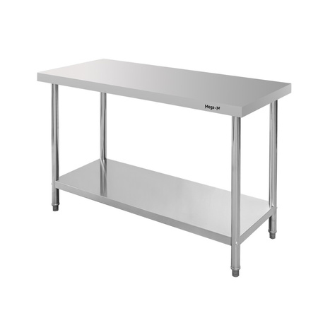Centralny dwupoziomowy stół gastronomiczny 120x60x85 cm został wykonany ze stali nierdzewnej o grubości 0,6 mm, która jest odporna na intensywną eksploatację, zarysowania i korozję oraz biologicznie obojętna (nie wchodzi w reakcję z żywnością). Stół gastronomiczny Mega-M STANDARD został wyposażony w dolną półkę, na której możliwe jest przechowywanie naczyń i akcesoriów potrzebnych w kuchni oraz regulowane nóżki, za pomocą których można dopasować stół do każdego nawet nierównego podłoża. Dzięki swojej gładkiej powierzchni mebel jest łatwy do utrzymania w czystości.