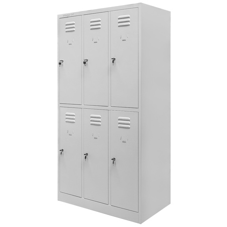 Szafka skrytkowa Mega-M przeznaczona jest do przechowywania odzieży roboczej i rzeczy osobistych. Szafka BHP posiada 6 oddzielnych komór, każda wyposażona jest w drążek z haczykami. Całość została wykonana ze stali malowanej proszkowo na szary kolor. Dzięki temu szafka BHP jest odporna na uszkodzenia i korozję. Taka szafka ubraniowa doskonale sprawdzi się w szatniach pracowniczych, na siłowniach czy basenach. Otwory wentylacyjne zabezpieczają przed gromadzeniem się wilgoci.